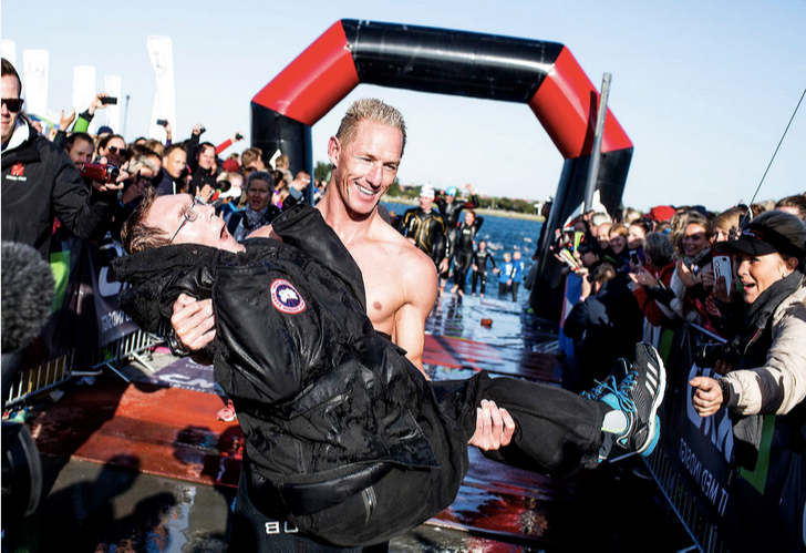 An der Ziellinie zog, schob und trug dieser Mann seinen behinderten Zwillingsbruder durch einen Ironman-Wettbewerb.