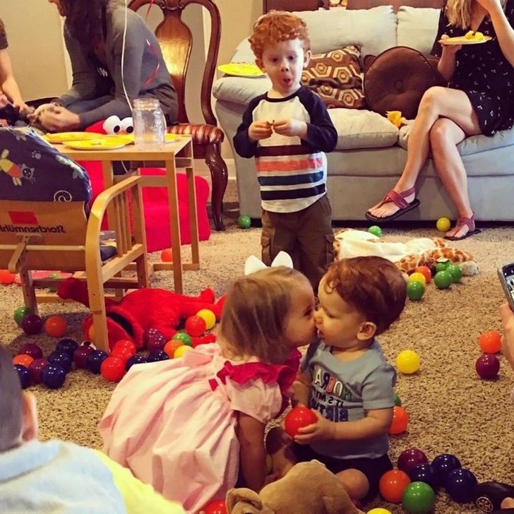 „Der große Bruder beobachtet, wie sein kleiner Bruder seinen ersten Kuss bekommt.“