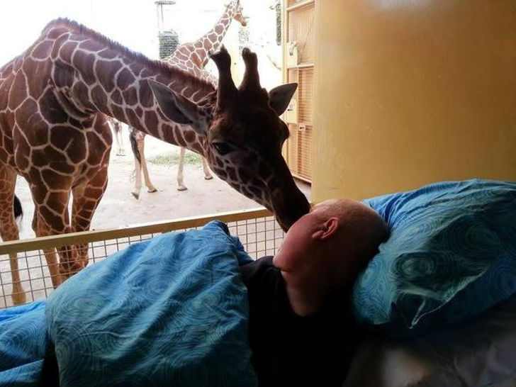 Trotz seiner psychischen Erkrankung hatte Mario 25 Jahre lang im Zoo gearbeitet. Bevor er mit einem Hirntumor diagnostiziert und ins Krankenhaus eingeliefert wurde, wollte er sich von seinen Lieblingsgiraffen verabschieden. Diese klugen Tiere kamen zu ihm und gaben ihm Küsse.