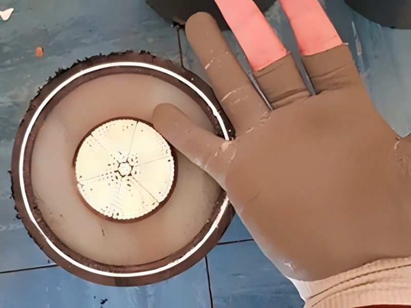 Hier sehen Sie ein unterirdisches Kabel für 400.000 Volt. Dieses Kabel hat den Durchmesser einer Hand; man kann sich den gewaltigen Stromschlag vorstellen, den eine Berührung auslösen würde. Da die Höchstspannung dieser Kabel bei 400 kV liegt, werden sie für Großprojekte wie Installationen für nationale Stromnetze verwendet.
