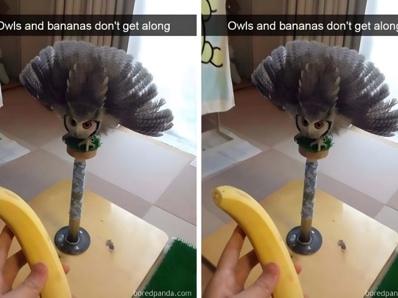 Dans une tournure amusante et inattendue, ce hibou semble être intimidé par une simple banane, se gonflant dans une tentative désespérée de l'effrayer et de la faire fuir. Parfois, un peu d'humour peut même ébouriffer les plumes d'un prédateur habituellement si confiant et majestueux.