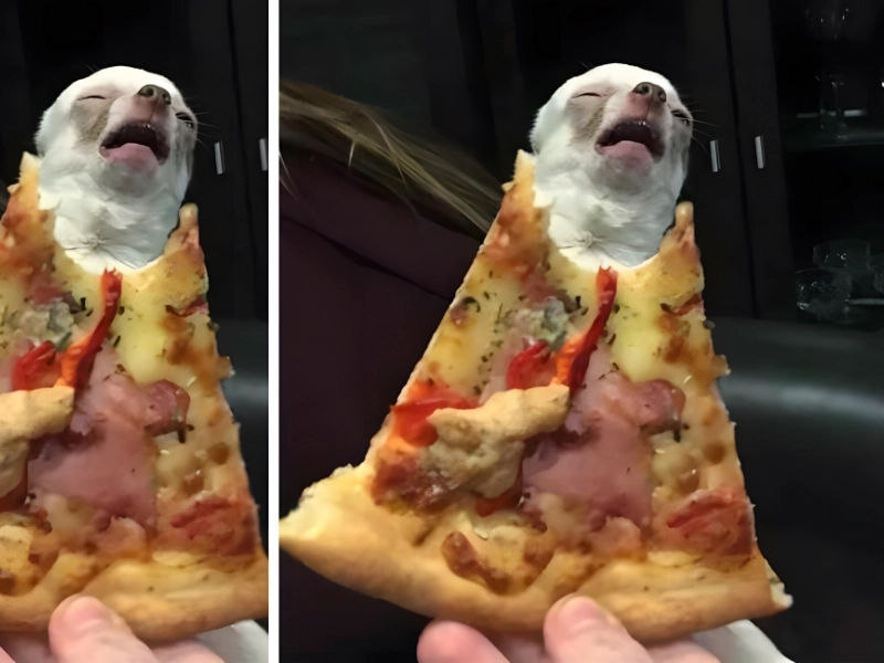 Cette photo amusante, probablement prise avec un smartphone, montre une part de pizza à laquelle il manque une bouchée, avec le visage d'un chihuahua parfaitement positionné dans l'espace vide. L'expression du chien est inestimable : heureux, triste, ou simplement désespéré d'obtenir une bouchée de cette délicieuse pizza.