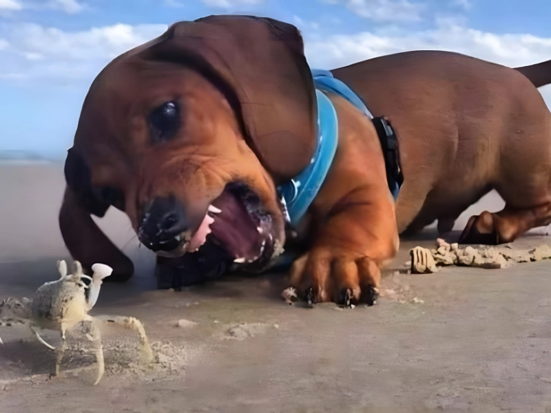 Ce teckel déterminé et courageux fait face à un minuscule crabe. En laisse, le chien essaie de paraître impressionnant et menaçant, tandis que le crabe lève une pince en défense, refusant de céder du terrain.