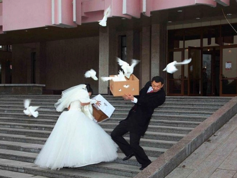 Le rêve de capturer des photos adorables avec des pigeons s'est rapidement effondré, prouvant que les animaux ont leurs propres plans. Le résultat est une image candide et légère qui se démarque des albums de mariage traditionnels. Cette tentative ratée est devenue finalement un souvenir bien plus mémorable que n'importe quelle pose conventionnelle.