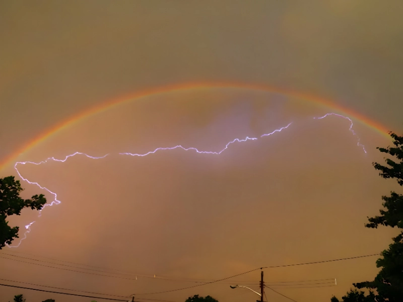 Cette photo remarquable et exceptionnelle capture trois merveilles naturelles impressionnantes dans un seul cadre photographique, si vous regardez attentivement tous les détails. Elle montre un éclair lumineux semblant rebondir spectaculairement sur un double arc-en-ciel vibrant, créant ainsi une scène absolument hypnotisante et fascinante pour tous ceux qui la contemplent.