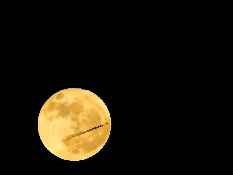 Alors que la lune domine majestueusement le ciel, la traînée éphémère de l'avion rehausse encore son éclat lumineux. Cette scène magique et poétique invite les spectateurs à rêver de sorcières volant à travers la nuit étoilée, se découpant en silhouettes contre la lune brillante et mystérieuse.