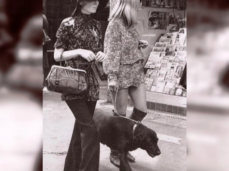 Une femme élégante et gracieuse tient tendrement un chiot adorable, rayonnant de grâce naturelle et de chaleur humaine—deux qualités précieuses qui ont rendu les icônes de cette époque si mémorables, aimées et chéries par tous.