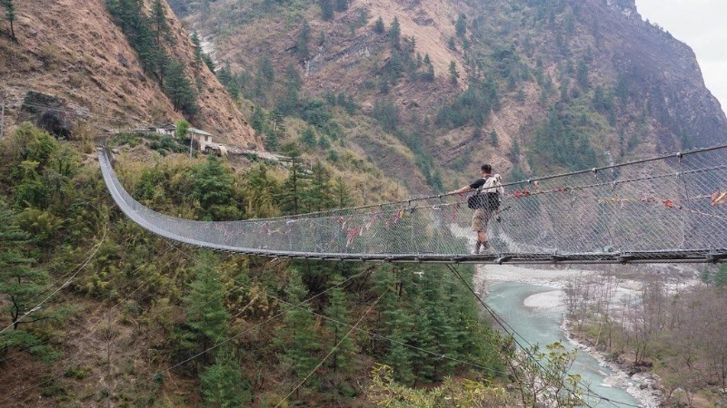 Le pont suspendu de Ghasa est un passage étroit et oscillant très haut au-dessus d'une gorge spectaculaire au Népal. Ce ne sont pas seulement les gens qui utilisent ce pont, des troupeaux de bétail le traversent quotidiennement, leurs sabots claquant sur les planches de bois. Observer les animaux se frayer un chemin à travers cette travée étroite est à la fois fascinant et impressionnant, un rappel du rôle essentiel que joue ce pont dans la vie rurale locale.