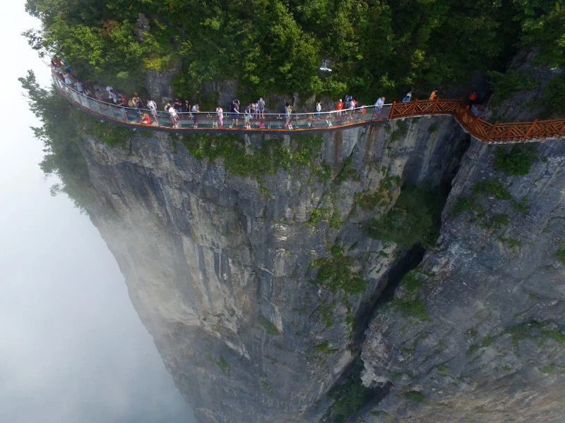 Très haut au-dessus du monde terrestre, la passerelle de Tianmen s'accroche aux falaises abruptes de la montagne Tianmen à une altitude impressionnante de près de 1 430 mètres. Ce pont au sol de verre transparent ne mesure qu'un mètre de large, offrant une vue vertigineuse directement vers la vallée en contrebas. Marcher ici constitue une aventure qui fait battre le cœur, parfaite pour les amateurs de sensations fortes qui recherchent à la fois des paysages époustouflants et une montée d'adrénaline intense. Chaque pas met à l'épreuve votre courage alors que vous marchez sur des panneaux transparents suspendus dans le ciel.