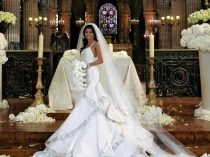Eva Longoria a porté une création d'Angel Sanchez confectionnée dans un organza luxueux et de la soie raffinée. Reconnue pour son élégance distinguée, la robe présentait une silhouette fluide et un savoir-faire artisanal remarquable dans les moindres détails. Le choix de Longoria est devenu un véritable symbole de la sophistication hollywoodienne, inspirant les mariées qui recherchent à la fois grâce naturelle et allure moderne contemporaine.