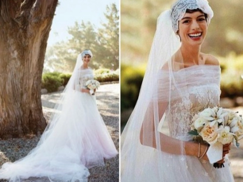 Anne Hathaway a choisi une création Valentino pour son mariage, rayonnant de romance et de féminité délicate. La traîne rose tendre et le voile en dentelle ont ajouté une touche de rêve enchanteur, tandis que les détails délicats ont mis en valeur son goût raffiné et son élégance intemporelle qui la caractérisent si bien.