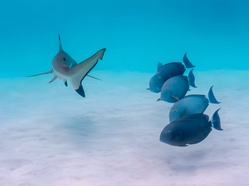 Cette photographie impressionnante et remarquable montre quatre poissons-chirurgiens suivant docilement un requin à pointe noire à Moorea, en Polynésie française. Dans la mer profonde, les requins règnent en maîtres absolus, et ces poissons-chirurgiens savent parfaitement rester immobiles et calmes quand un requin est dans les parages. L'image évoque subtilement des thèmes de pouvoir et d'équilibre naturel, méritant une place dans la collection Comedy Wildlife 2023.