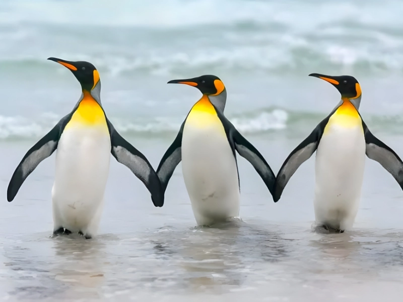 Cette image douce et attendrissante montre trois manchots royaux majestueux marchant le long de la plage sablonneuse, se tenant mutuellement les ailes avec tendresse. Elle a été choisie pour la collection Comedy Wildlife 2023, soulignant les similitudes touchantes entre les relations animales et humaines.