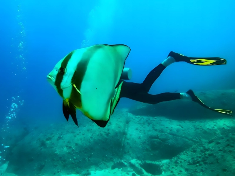 Dans cette image amusante et surprenante, l'un des compagnons plongeurs de Danielle est caché par un poisson-chauve-souris nageant juste devant eux, créant ainsi l'illusion parfaite et convaincante d'une véritable sirène. Quelle chance incroyable pour une plongeuse débutante !
