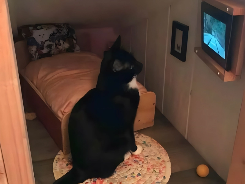 Ce chat adorable et mignon possède son propre espace privé et confortable sous les escaliers, un peu comme la chambre de Harry Potter, mais en beaucoup plus luxueux et raffiné. L'espace comprend un tapis rond douillet, une balle amusante pour jouer, un petit cadre photo décoratif, et un lit confortable avec un coussin assorti au thème félin. Le point fort remarquable ? Une télévision personnelle !