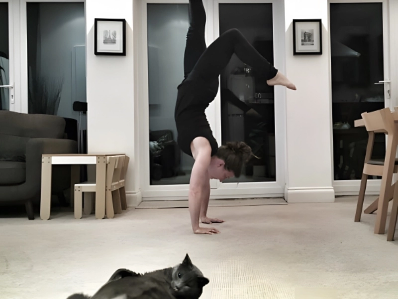Ce chat est dans une pose de chien tête en bas parfaite ! Pendant que la propriétaire fait du yoga avec concentration, le chat montre ses propres mouvements et sa flexibilité. L'humain embarrasse peut-être le chat, qui a l'air de n'avoir jamais fait de yoga auparavant de sa vie. Pourtant, essayer est ce qui compte le plus dans la vie. Même un chat paresseux peut s'améliorer avec de la pratique régulière et de la persévérance.