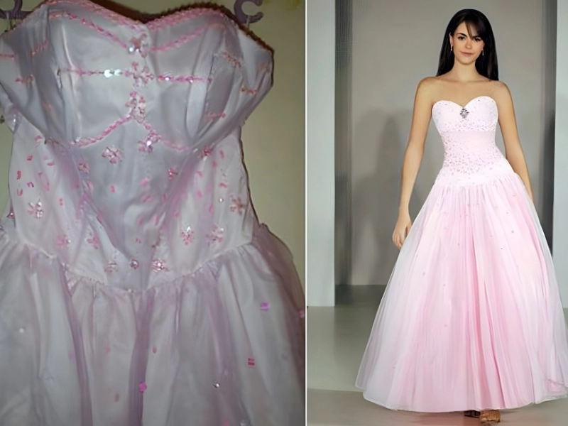Prix d'origine de la robe : 500 $* ; Fabricant d'origine : Inconnu Contrefaçon acquise auprès de : GorgeousDressesOnline.com Achetée pour : 75 $* Il est difficile de savoir par où commencer avec cette imitation car il y a tellement de choses qui ne vont pas. La robe originale a un décolleté cœur, des décorations exquises et est d'un magnifique rose uni. La reproduction fait à peine office de projet scolaire des années 80 et est très loin de l'original.
