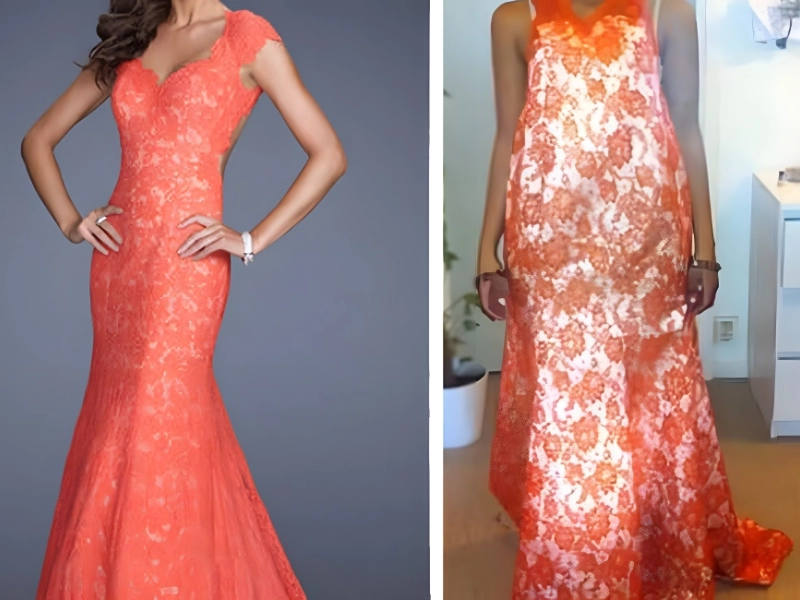 Prix d'origine de la robe : *90 $* Créée par : AliExpress Contrefaçon achetée sur : Inconnu Contrefaçon achetée pour : Inconnu Les vêtements ne font pas partie des nombreux articles pour lesquels AliExpress peut être recommandé. Ce site est bien connu pour constamment décevoir en matière de robes et d'autres produits. Dans ce cas, ce qui aurait pu être une superbe robe longue en dentelle orange est devenu un cauchemar qui ressemble à une vilaine éruption cutanée.