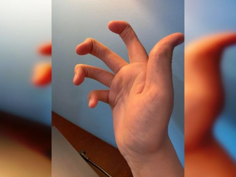 Une main dont les doigts sont dépourvus des articulations médianes, une condition appelée symphalangisme.