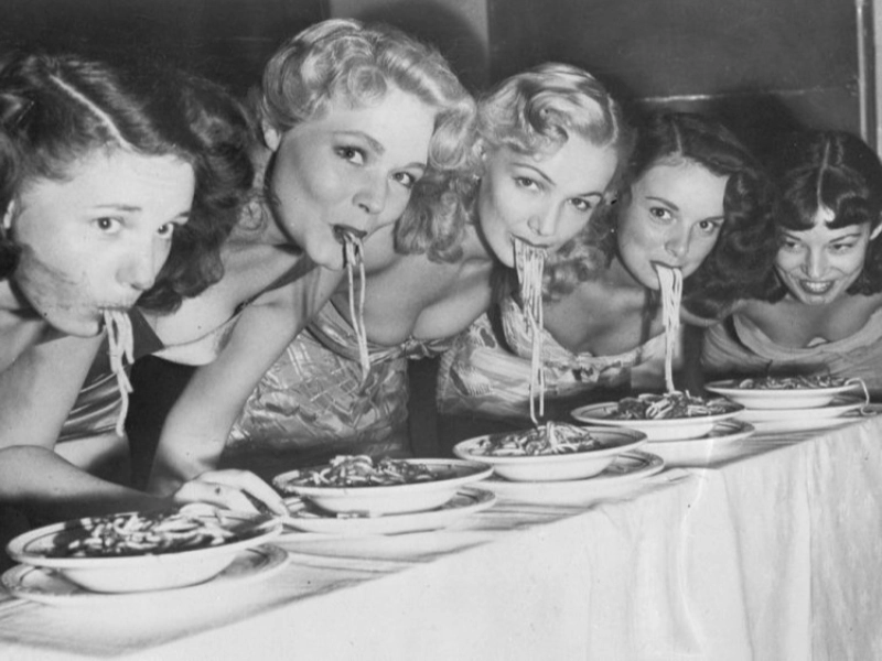 Un célèbre concours de mangeurs de spaghetti organisé en Italie au siècle dernier. Ces compétitions, populaires depuis le début du XXe siècle, sont devenues un passe-temps apprécié, avec des événements organisés dans de nombreuses villes du pays.