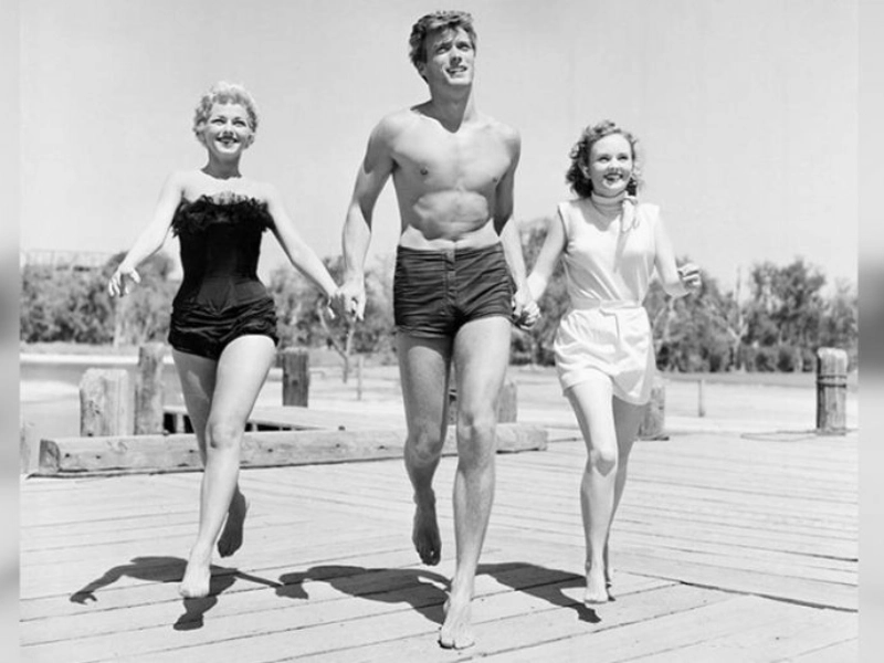 1954 : Clint Eastwood sur une plage de San Francisco en compagnie de deux actrices. À l'époque, l'acteur était encore peu connu et tournait principalement dans des séries télévisées et des films de série B.