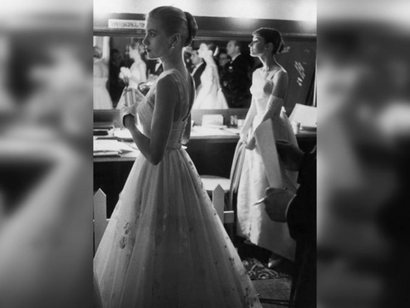 En coulisses lors de la cérémonie des Oscars de 1956, les légendaires actrices hollywoodiennes Audrey Hepburn et Grace Kelly. Toutes deux étaient célèbres pour leur grâce, leur beauté, leur talent et leur engagement dans des œuvres caritatives.
