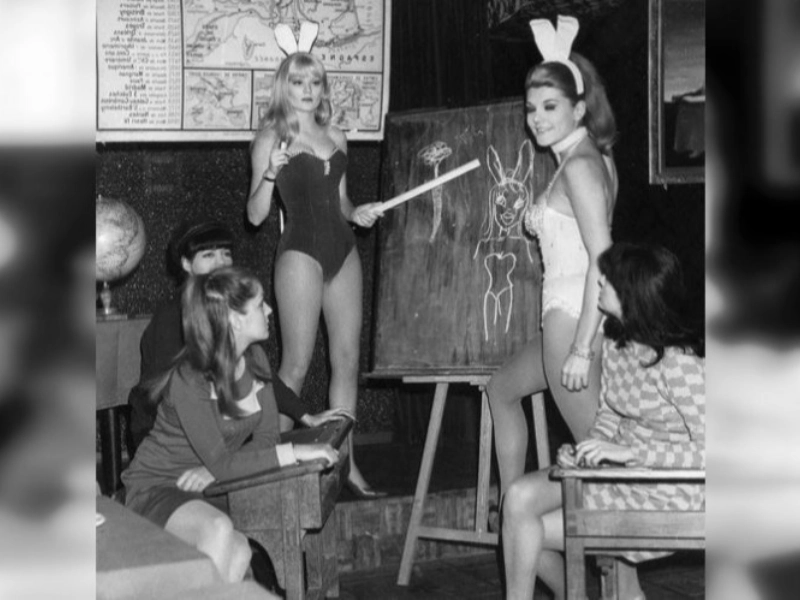 1965 : Une leçon pour les futures « Bunnies » du Playboy. Leur formation comprenait des cours de maintien, d'étiquette et de séduction.