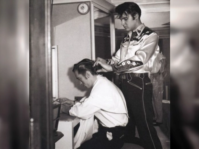 En 1960, le célèbre chanteur Elvis Presley coupe les cheveux de Johnny Cash. Deux icônes majeures de la musique du XXe siècle, Elvis, le « King of Rock and Roll », et Johnny Cash, le « Man in Black », partagent ce moment insolite.