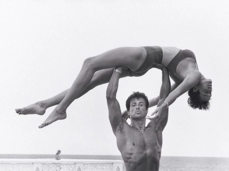 En 1979, Sylvester Stallone fait une démonstration de force à une mannequin sur une plage de Malibu. Cette séance photo faisait partie de la campagne de promotion de son film « Rocky II », où il incarne à nouveau le boxeur Rocky Balboa.